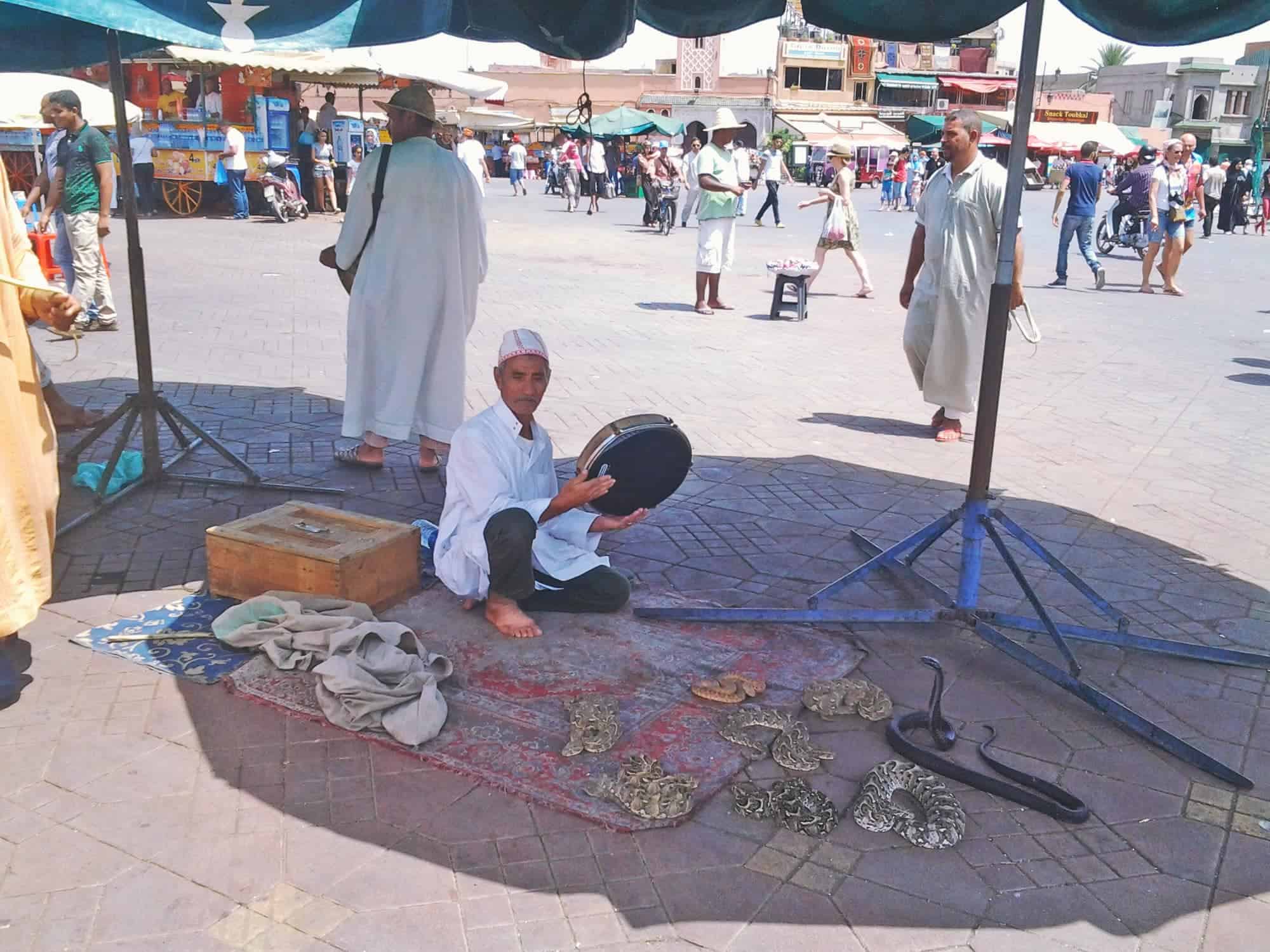 Llegada a Marrakech: Primer contacto con la ciudad roja y su animada plaza Jemaa el Fna.
