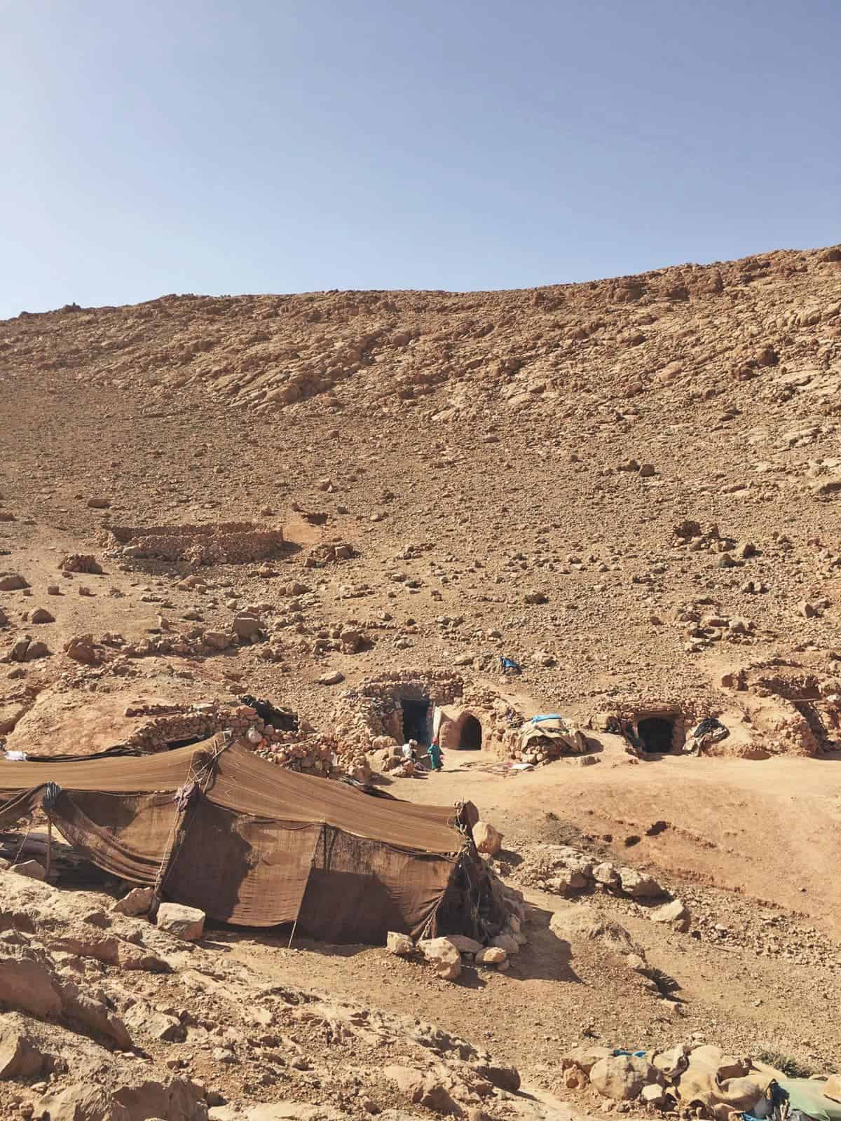 Hoy tendremos una jornada más relajada. Caminaremos hacia Annou o Efran, donde podremos visitar las cuevas naturales. Si el grupo lo desea, podemos extender la caminata para llegar a las cascadas de Alkechtefen y disfrutar de un refrescante baño. Cena y alojamiento en un campamento cerca de una familia bereber nómada. Esta etapa puede durar entre 6 y 8 horas.